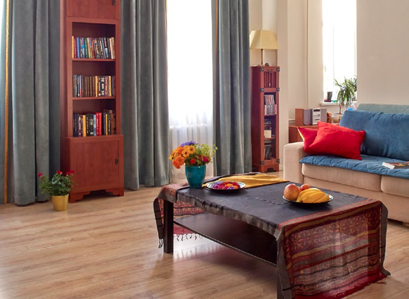 - Zilo mājokļa interjerā izmanto galvenokārt tekstilizstrādājumos. Vēsi zilas sienas vizuāli paplašina telpu. Šādu toņu vidē cilvēks jūtas labi un mierīgi.