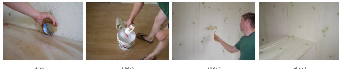 Pirms tapešu noņemšanas un līmēšanas atbrīvojam telpu no mēbelēm un citiem priekšmetiem, kas apgrūtinātu strādāšanu. (1.att, 2.att) Grīdas segumu vēlams pārklāt ar aizsargplēvi (3.att) un plēves sānus pielīmēt pie grīdas (4.att) ar krāsotāju lentas palīdzību. Aizsargplēve pasargās grīdu no ūdens un tapešu līmes.