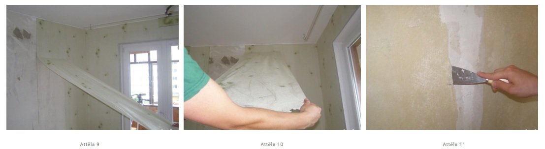 Kad esam visu sagatavojuši, laiks ķerties pie tapetēm. Tās kaut kādā veidā nāksies dabūt nost no sienas. Vispirms mēģinam tapetes noplēst. Ja tas neizdodas vai darbs rit ļoti lēni, nāksies tapetes samitrināt. Tapetes samitrināsim ar silta ūdens palīdzību, tam piejaucot trauku mazgājamo līdzekli (5.att). Trauku mazgājamais līdzeklis ātrāk sašķīdinās veco tapešu līmi un tā putas neļaus ūdenim tik ātri notecēt no sienas. Ūdeni uz tapetēm uzklājam ar otas, sūkļa vai rullīša palīdzību (6.att). Pāris minūtes tam ļaujam iesūkties tapetēs, tad tās noplēšam(7.att, 8.att,9.att). Vietās, kurās tapete nevēlas padoties, to vēlreiz samitrinam un noņemam ar špakteļlāpstiņas palīdzību (10.att,11.att). Pirms tapetes noplēšanas tāpat iespējams tapeti nosmērēt ar tapešu līmi, jo tā nenotek no sienas un viegli iesūcas tapetē.