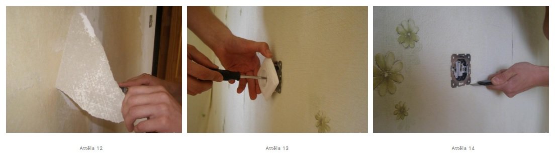 Kontaktiem un slēdžiem noņemam dekoratīvos paneļus (12.att) un ar papīra nazīti apgriežam apkārt tā metāla rāmītim (13.att). Pēc tam tapeti samitrinam (elektrībai jābūt izslēgtai) un noplēšam (14.att). Šādi rīkojoties, kontakts nebūs jāizņem no tā ligzdas un pēc tam jāievieto atpakaļ, kas, kā zināms, ne vienmēr notiek tik gludi, cik mēs vēlētos.