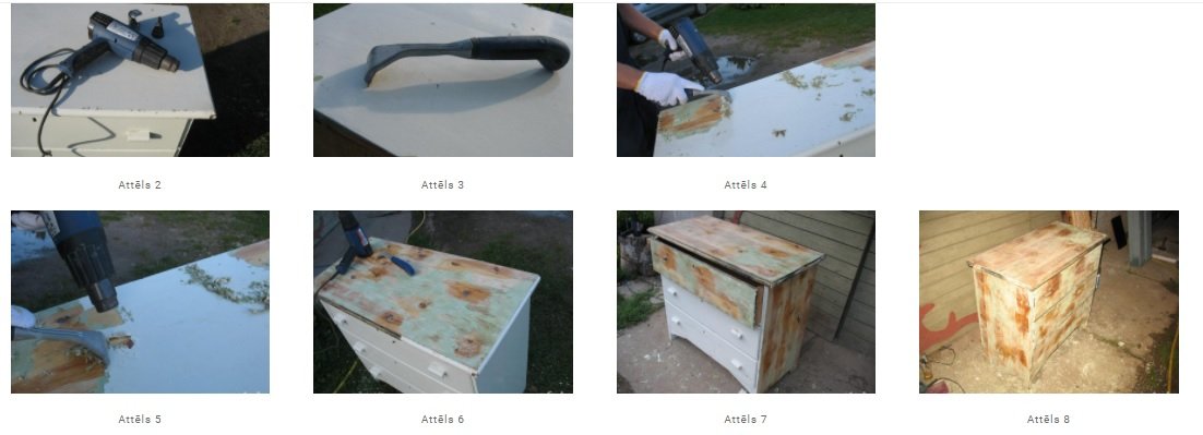 Mūsu atjaunojamā mēbele ir veca kumode, kas daudzu gadu laikā ir vairākas reizes pārkrāsota, taču žēl to būtu izmest, tāpēc padarīsim to skatam pievilcīgāku. (1.att) Kumodes atjaunošanu sākam ar vecā krāsas slāņa noņemšanu, to paveicam ar karstā gaisa fēna palīdzību (2.att) un skrāpi (3.att). Pūšot ar fēnu karstu gaisu uz vecās krāsas tā sakarst un atlobās no koka virsmas, (4.att) tad ar skrāpi to nokasām. (5.att, 6.att, 7.att, 8.att)